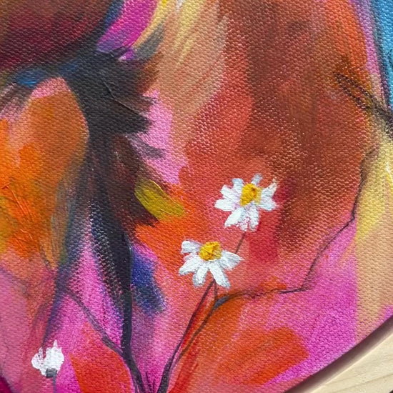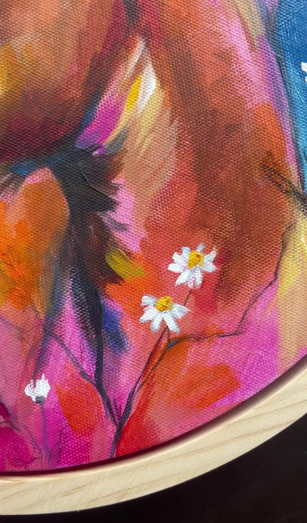 Tiny little daisies wave in the wild Scottish winds, small but mighty, much like the Shetland pony! Named Gowan, which is the Scots word for daisy, this round canvas has gold metallic plaint that glints in the light and is finished off in a waxed bare wood frame.